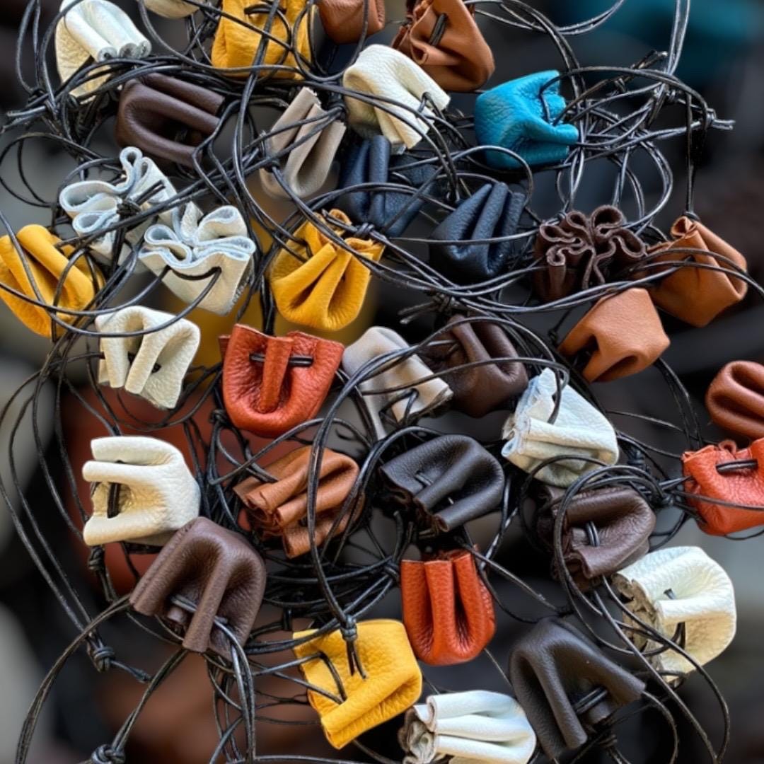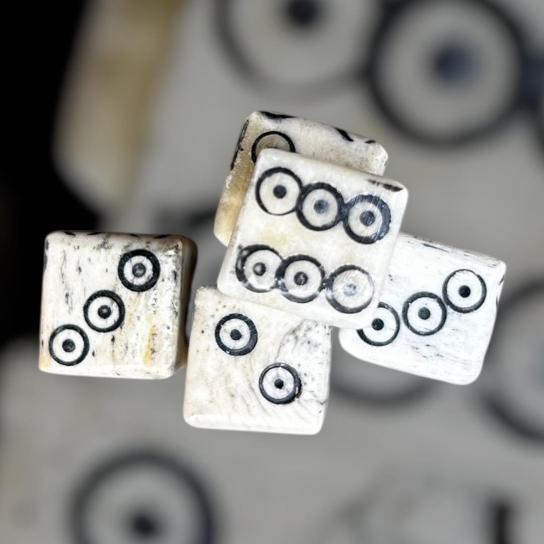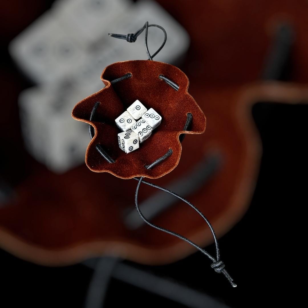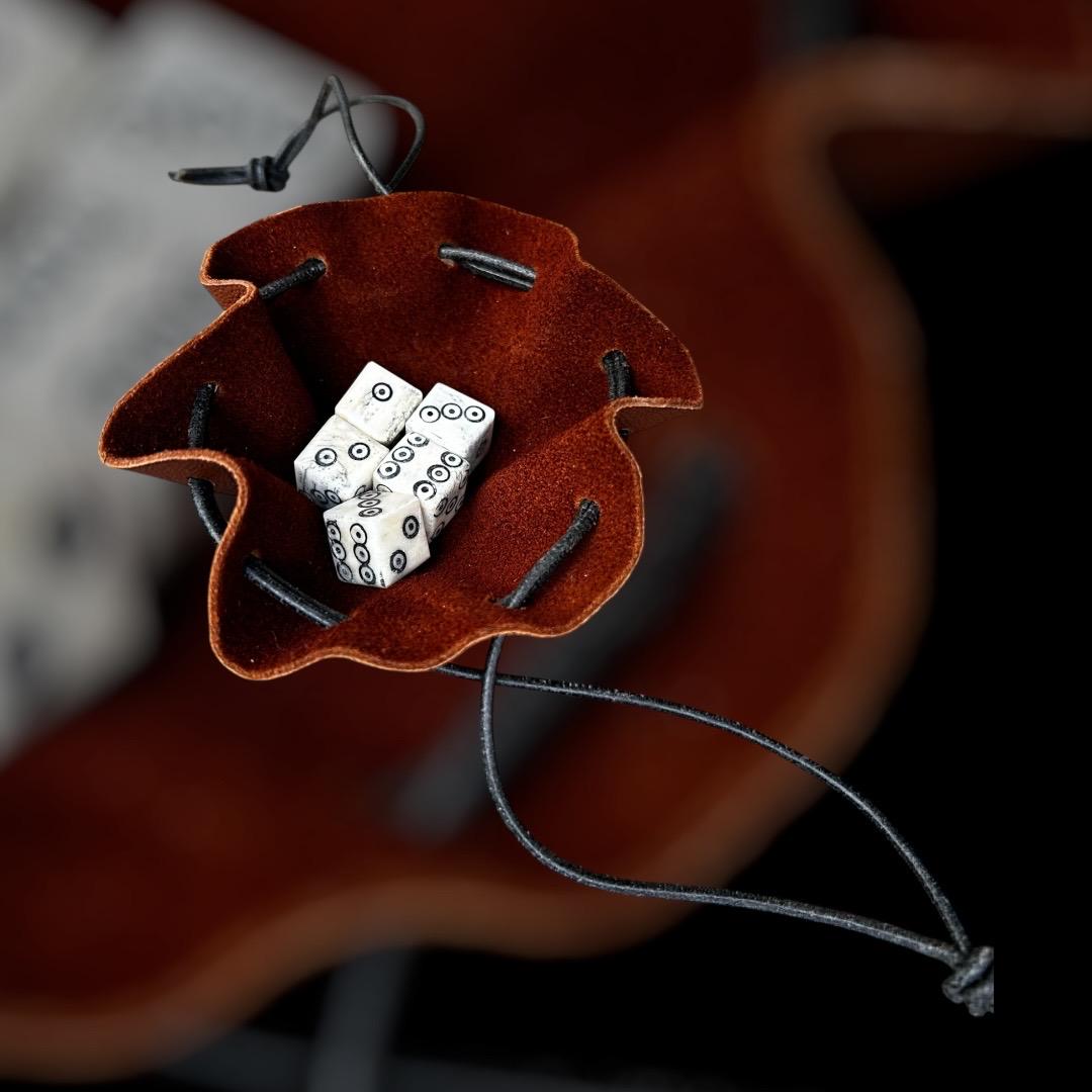 Die Würfel kommen in einem Set aus fünf Würfeln und mit einem Lederbeutel (9 cm Durchmesser) in Zufallsfarbe.