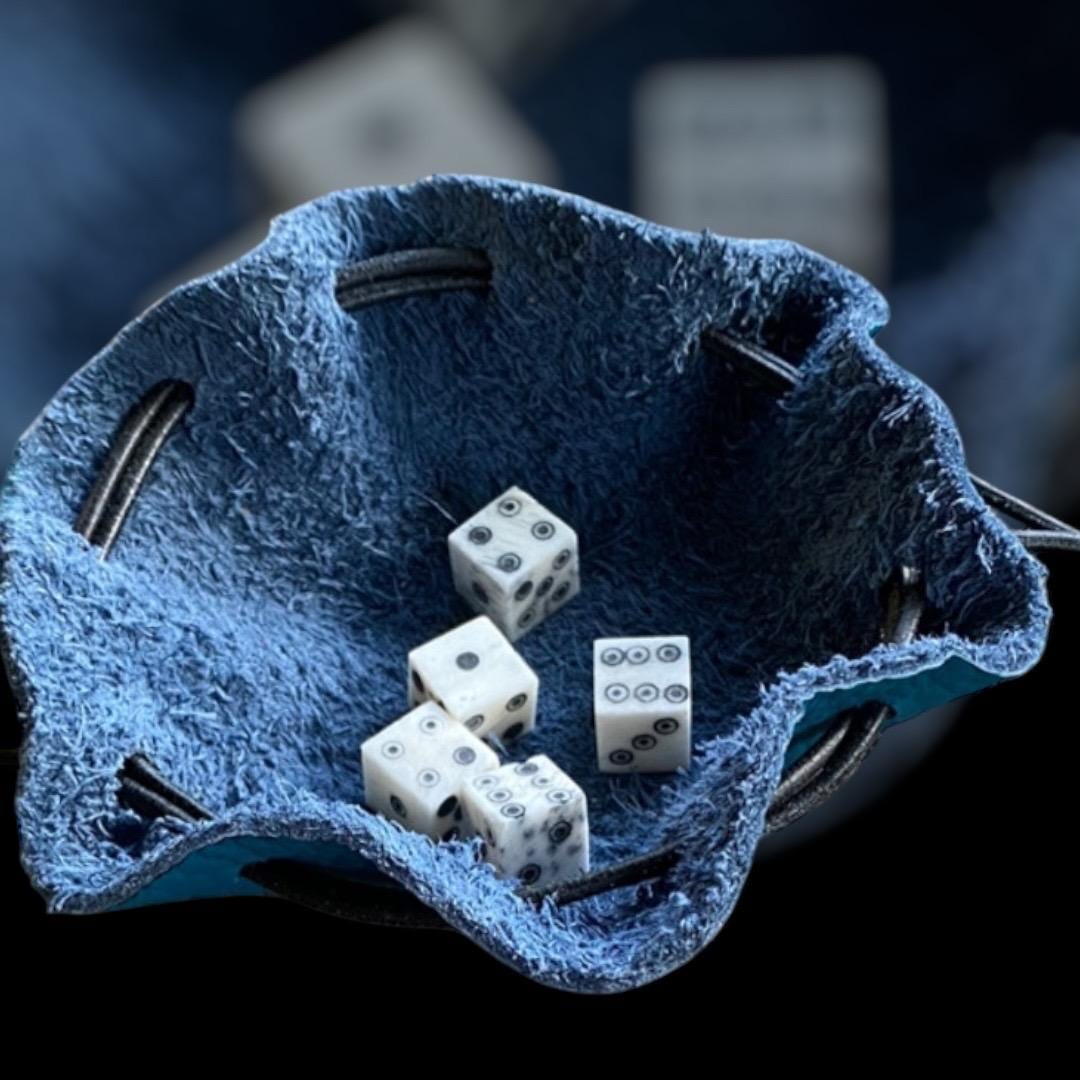 Die Würfel kommen in einem Set aus fünf Würfeln und mit einem Lederbeutel (9 cm Durchmesser) in Zufallsfarbe.