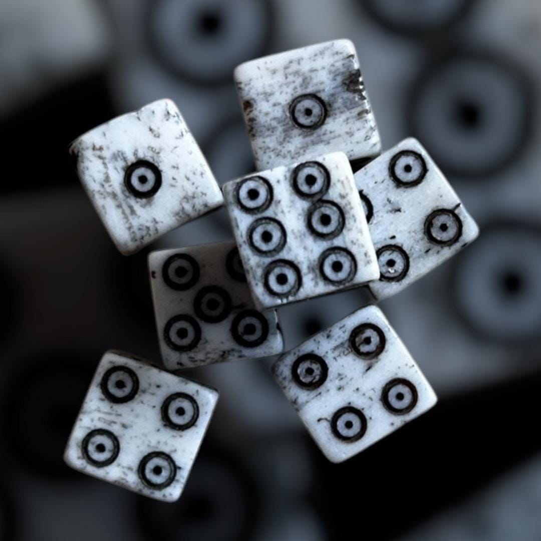 Beinwürfel nach zahlreichen Funden der Römerzeit und des Mittelalters, polierter Knochen mit Einlage aus Ebenholzstaub, ca. 1x1cm