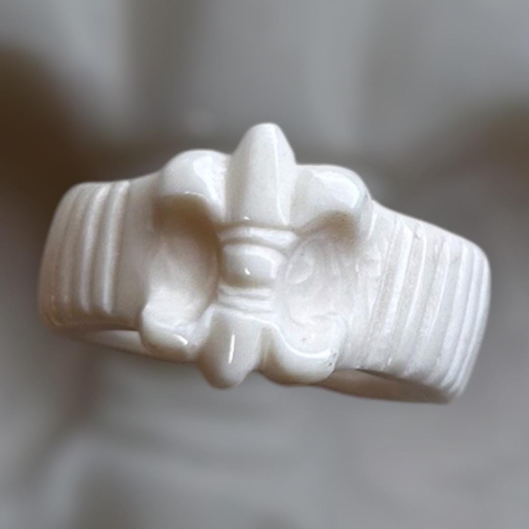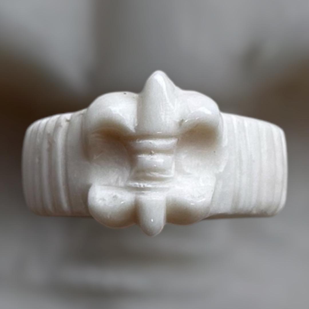 Gotischer Ring aus Knochen, 13.-15. Jahrhundert, nach einem Fund aus Kraljevo in Serbien Neben Ringen aus Edelmetall waren im Spätmittelalter auch Knochenringe sehr beliebt. Die Replik nach einem Fund aus Kraljevo in Serbien zeigt als Motiv die Lilie, die ein häufig verwendetes Element in vielen Wappen war und für die Jungfrau Maria steht. Solche Ringe wurden sowohl von Männern als auch Frauen getragen. Bei Bestellung bitte Ringgröße angeben. Jeder Artikel wird von Hand einzeln geschnitzt . Aufgrund dessen und da jedes Stück Knochen einzigartig ist kann es bei dem Artikel zu leichten Abweichungen kommen.