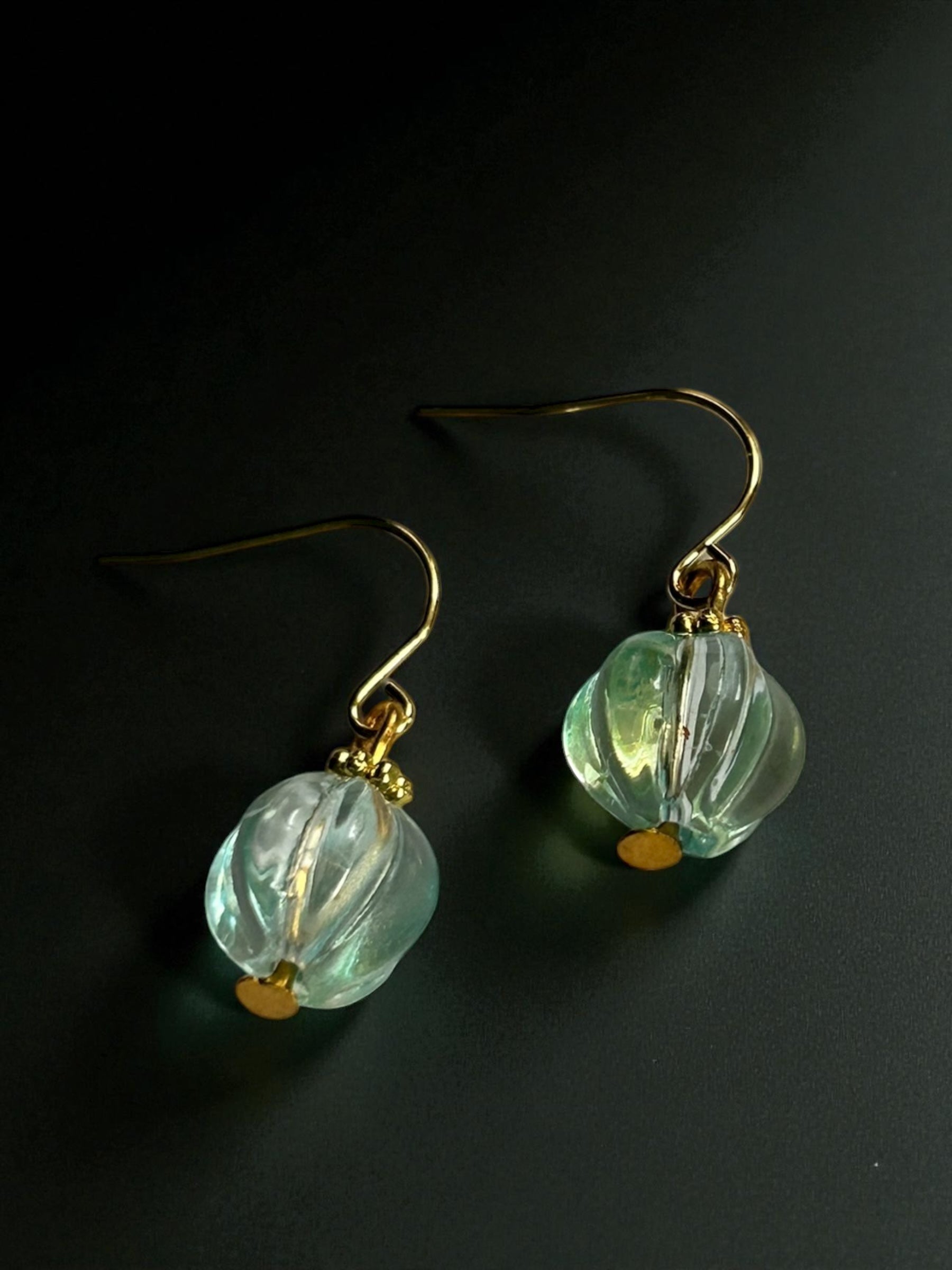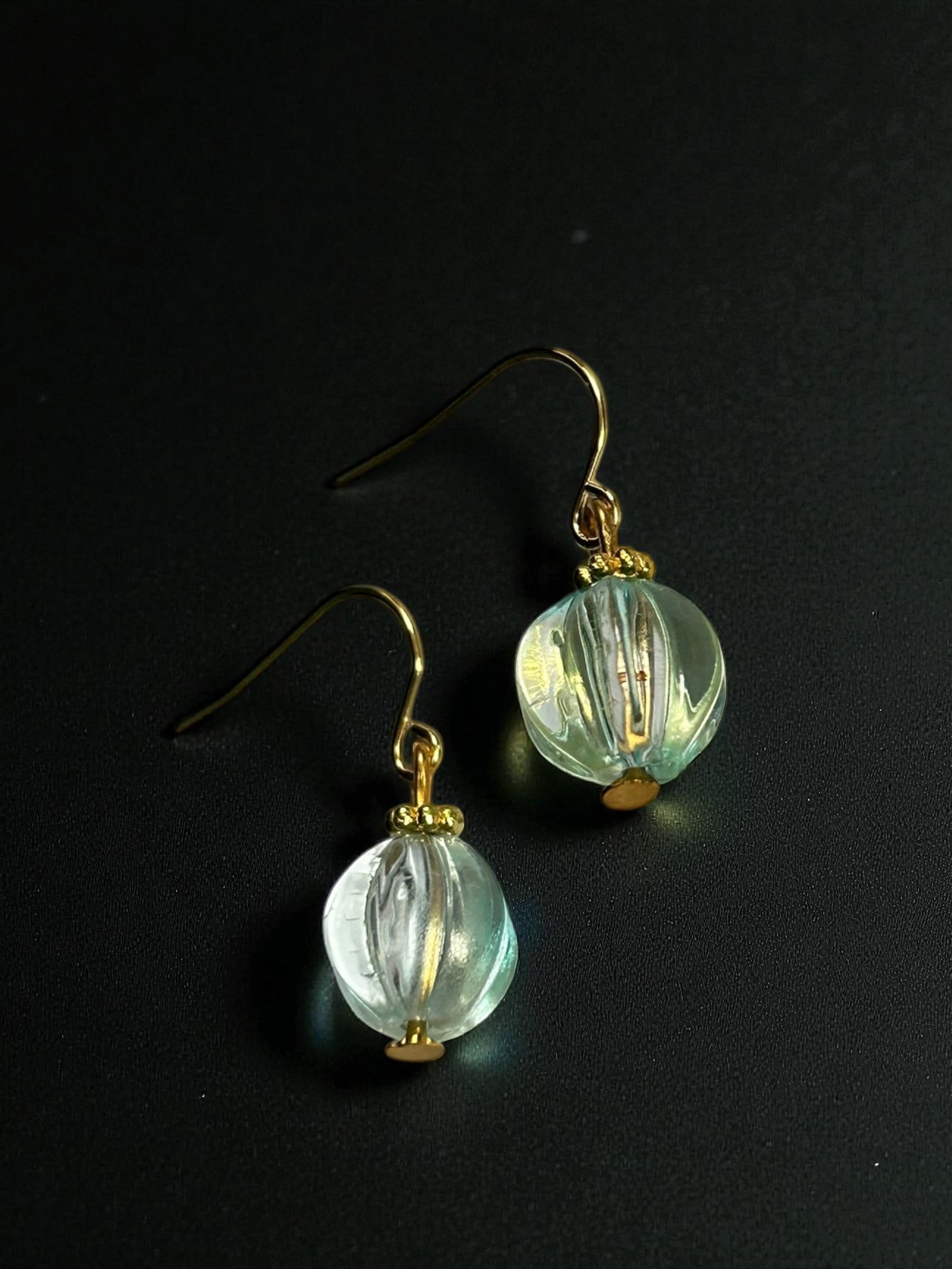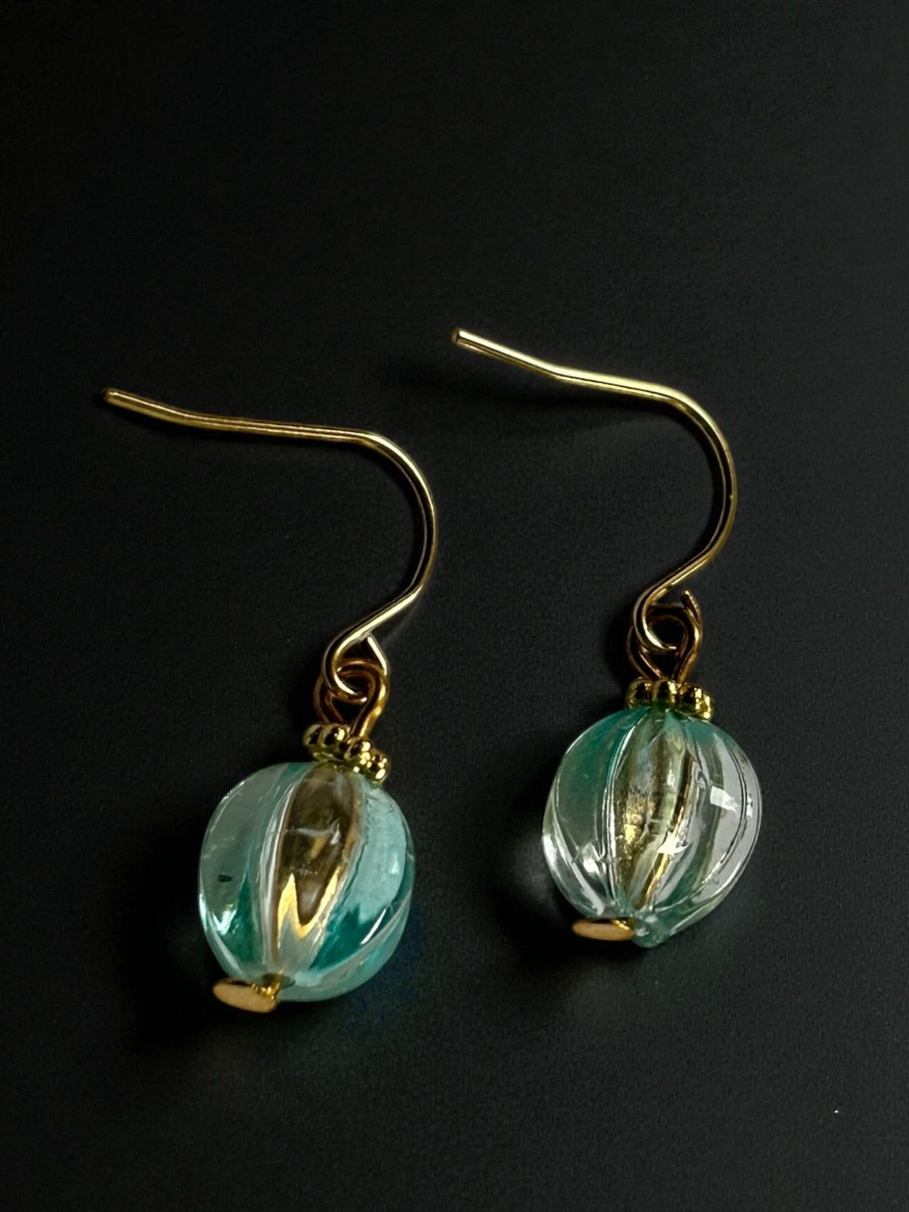 Melonenperlen sind seit der Eisenzeit eine der beliebtesten Glasperlenformen. Bei Germanen, Kelten und Römern fanden sie vielfach Verwendung, vom Pferdegeschirr bis zum Körperschmuck. Die hier nachgebildeten Ohrringe überraschen mit leicht changierender Oberfläche in zarten Pastelltönen. Der Haken ist aus vergoldetem Edelstahl und somit Antiallergen.