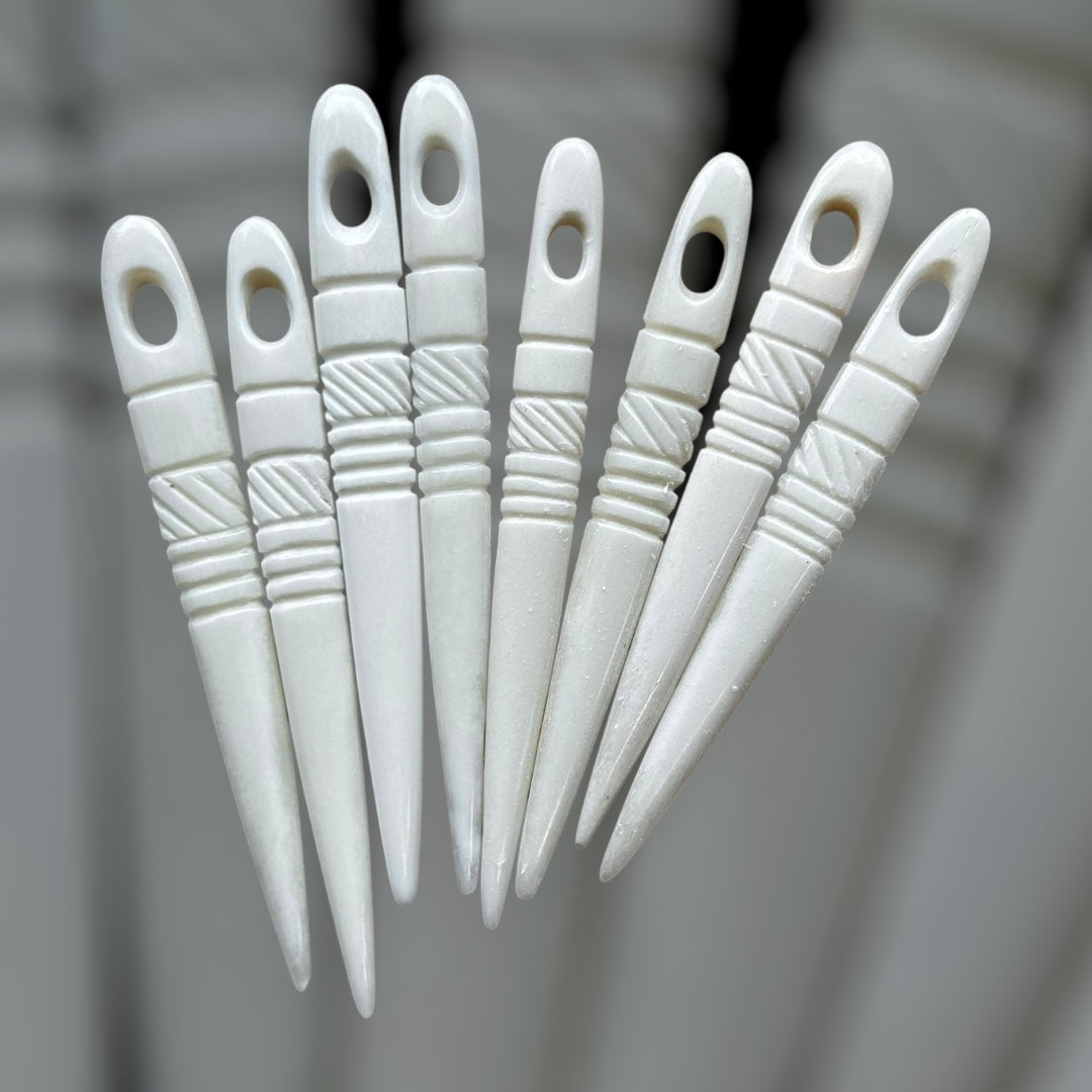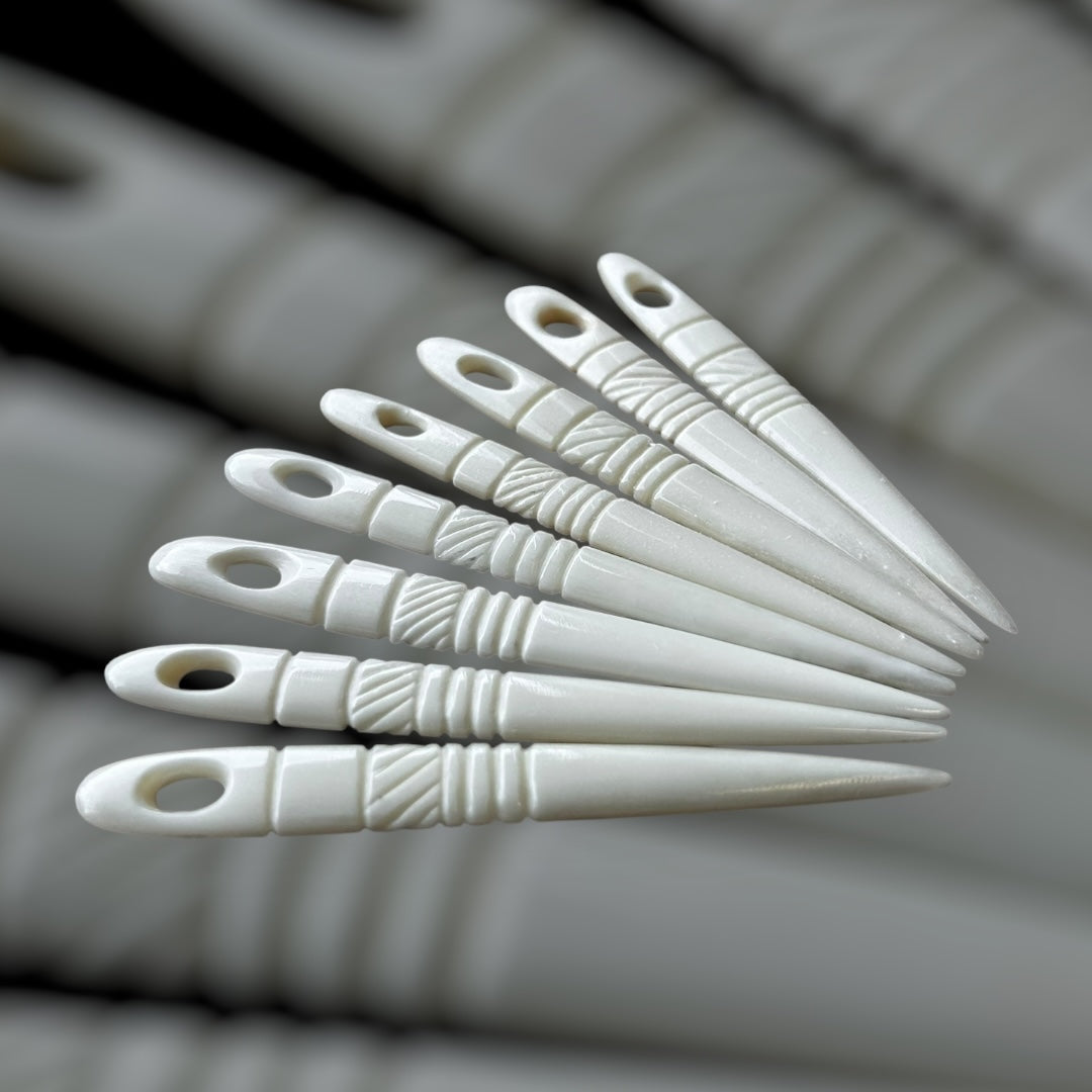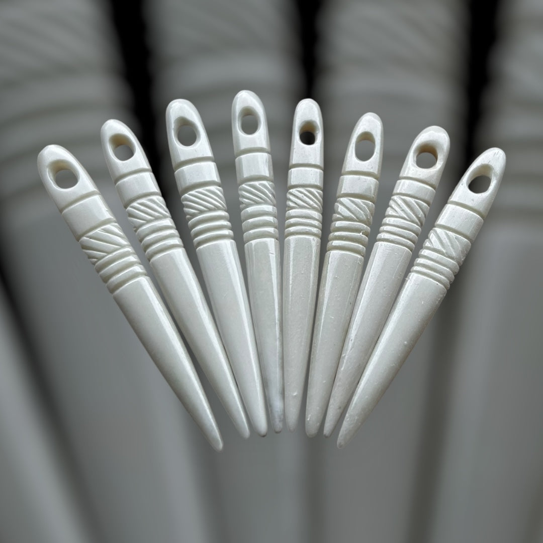Die Nadelbindtechnik ist eine uralte Fertigkeit um Textilien wie Socken, Handschuhe oder Mützen herzustellen. Seit der Bronzezeit lässt sich Nadelbinden archäologisch belegen, was diese Technik rund 5800 Jahre älter macht als das Stricken. Zum Nadelbinden braucht man lediglich eine Nadel, wobei sich Knochen auf Grund der glatten Oberfläche besonders gut eignet. Die Nachbildung der hier angebotenen Nadeln basiert auf verbreiteten Dekorationen der Römerzeit, jedoch auf keinem konkreten Fund. Sie sind damit für Darstellungen von der Eisenzeit bis ins Mittelalter grundsätzlich benutzbar.