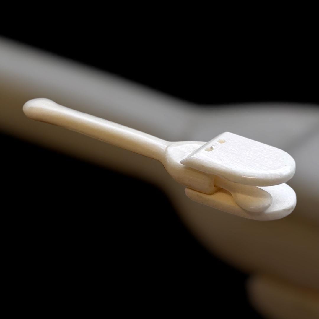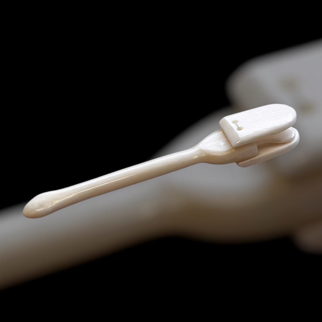 Diese, aus poliertem Knochen gefertigte, Kinderrassel basiert auf einem Fund aus der Stadt Herculaneum, die beim Ausbruch des Vesuv verschüttet wurde. Die Rassel ist somit auf das Jahr 79 fest datiert. Mit dem beweglichen Element sorgt sie für ein angenehmes Klappergeräusch, das Säuglinge unterhalten und beschäftigen sollte.