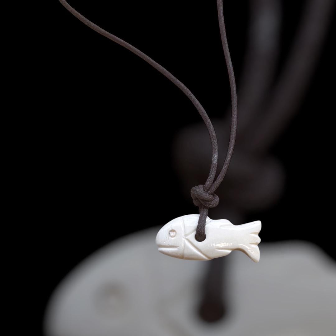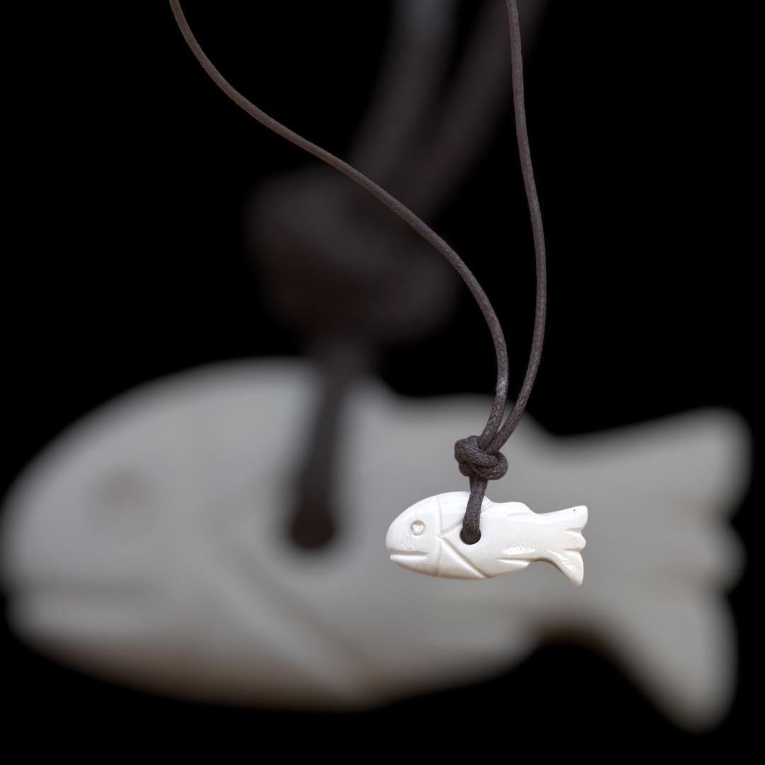Dieser Kettenanhänger in Form eines Fisches wurde nach einem römischen Fund aus Neapel gefertigt. Wie das Original besteht er aus Rinderknochen und kommt mit einem 2mm braunen Baumwollband. Fische waren beliebte Motive für römischen Schmuck, da sie mit Venus, der Göttin der Schönheit, vergesellschaftet wurden, die dem Mythos nach aus Meeresschaum geboren wurde.