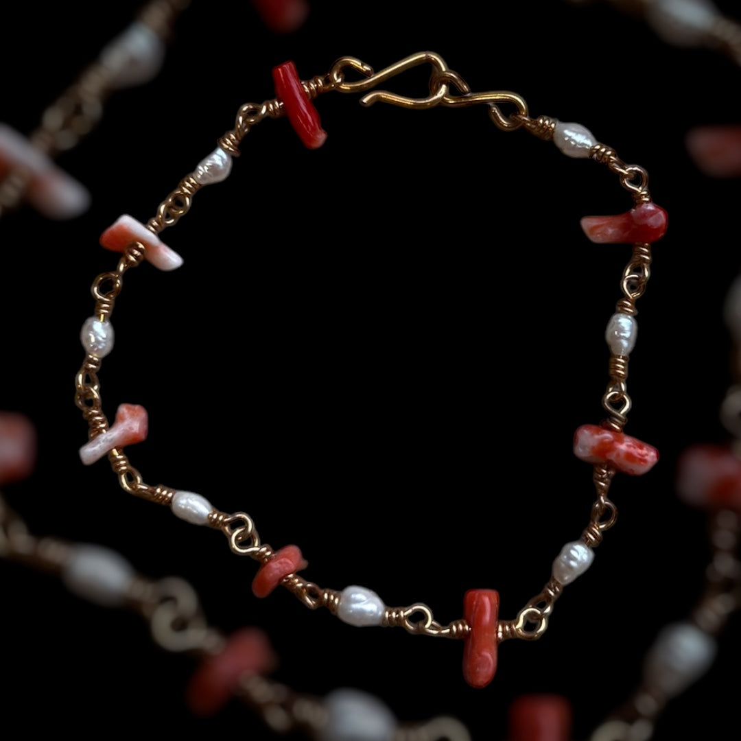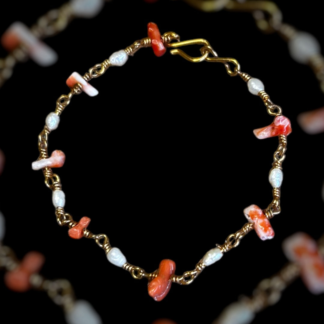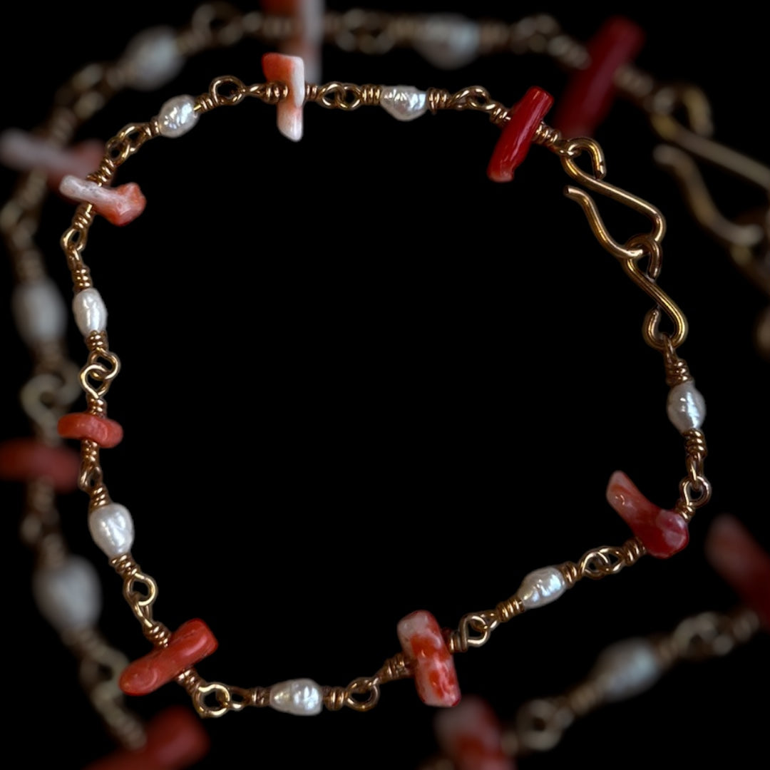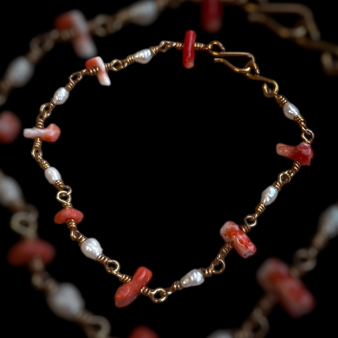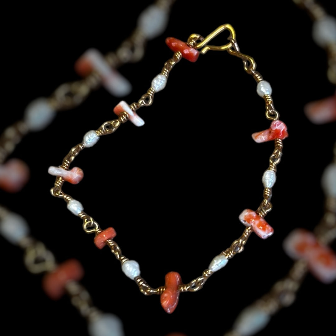 römisches Armband, 1. bis 4. Jahrhundert, Koralle und Süßwasserperlen, vergoldeter Draht, 19cm