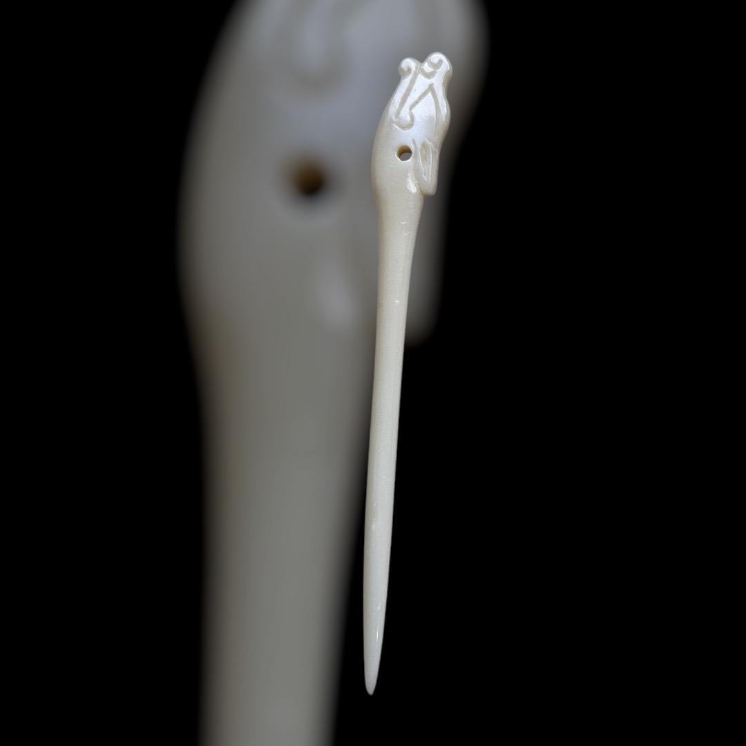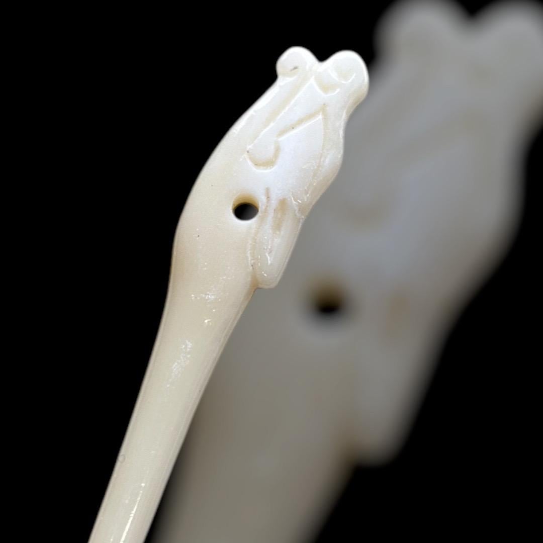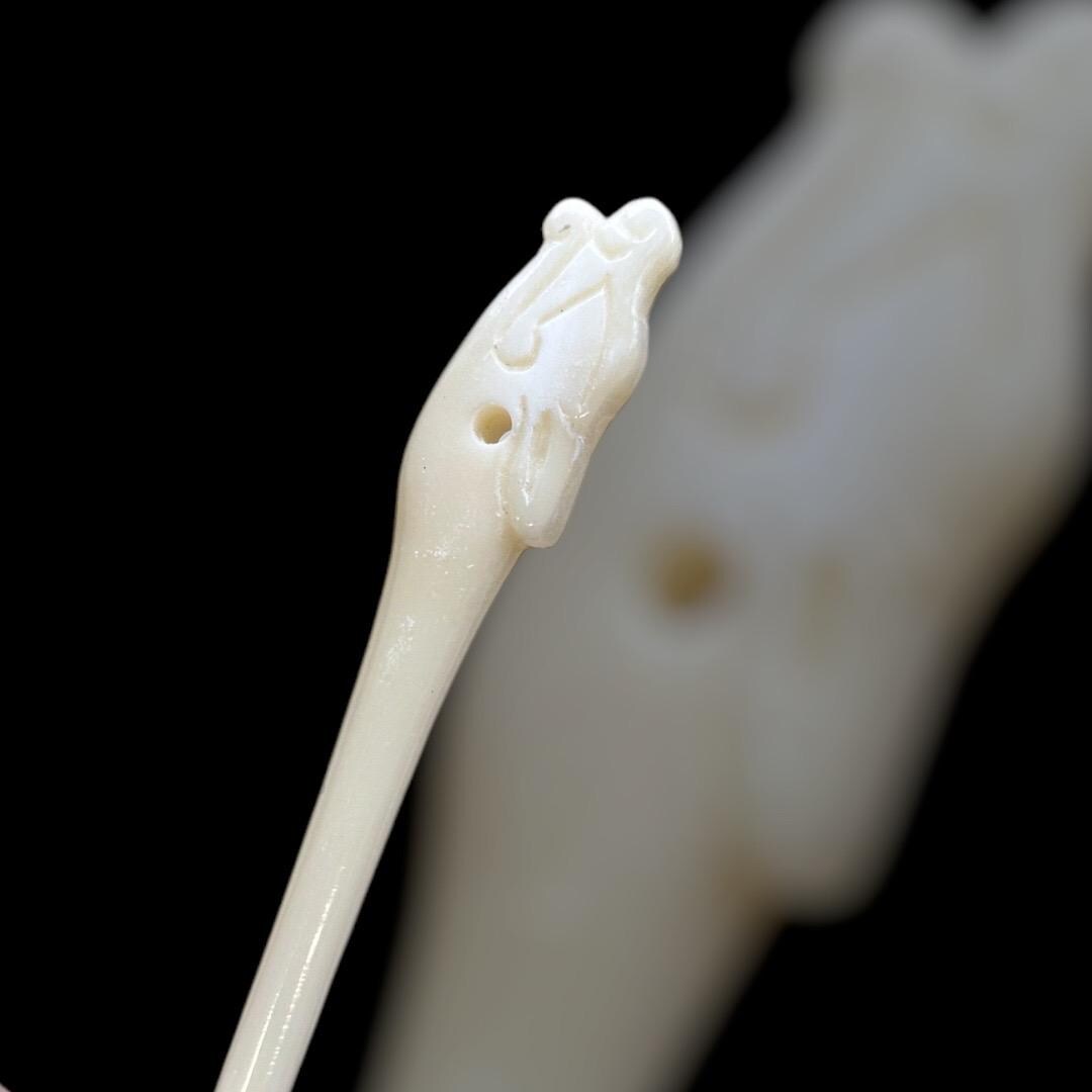 Diese Haarnadel oder Gewandnadel wurde nach einem Fund aus Sigtuna in Schweden gearbeitet . Wie im Original, wurde sie aus Knochen geschnitzt. Sie ist mit einem stilisierten Drachenkopf verziert und etwa 12cm lang. Der Knochen wurde auf Hochglanz poliert.