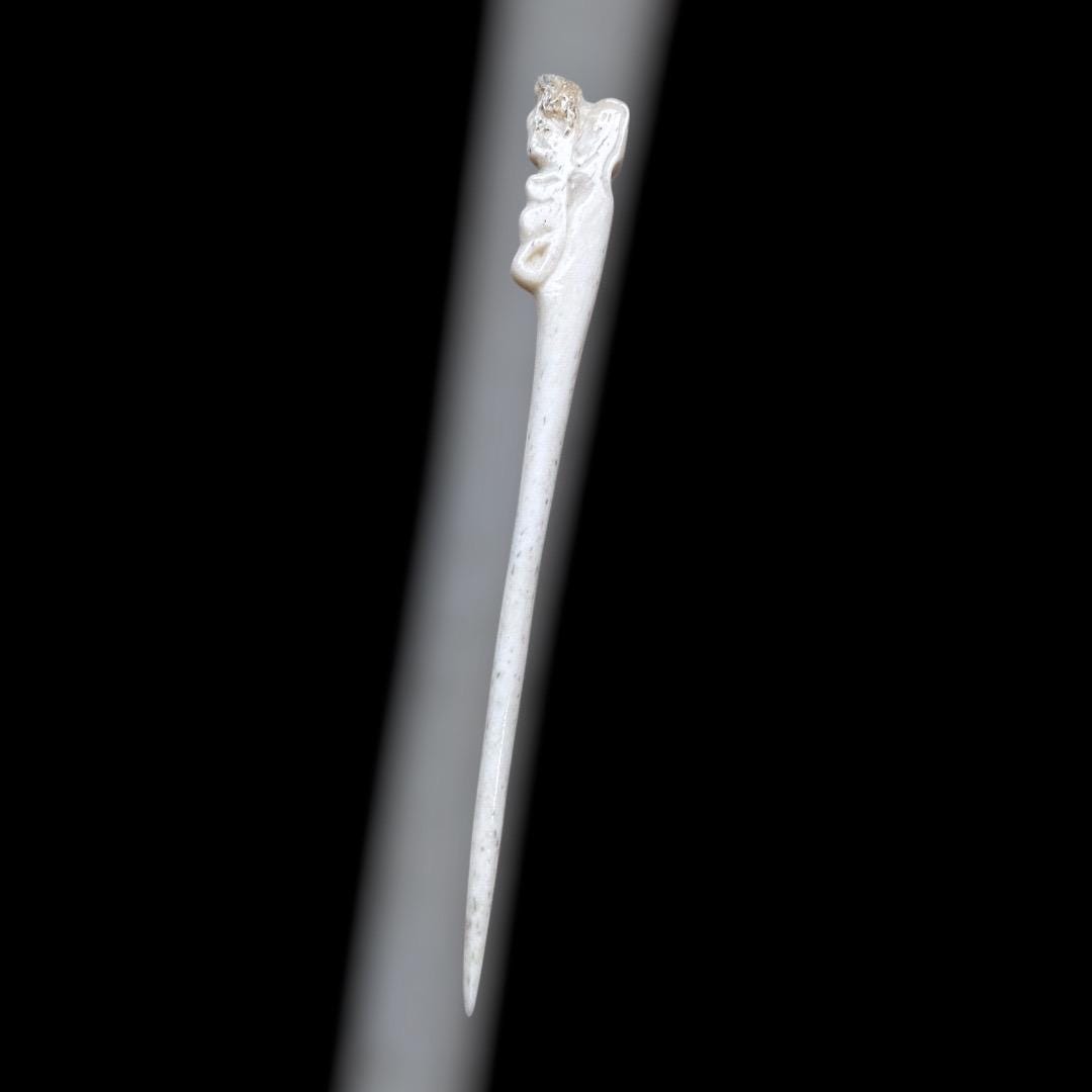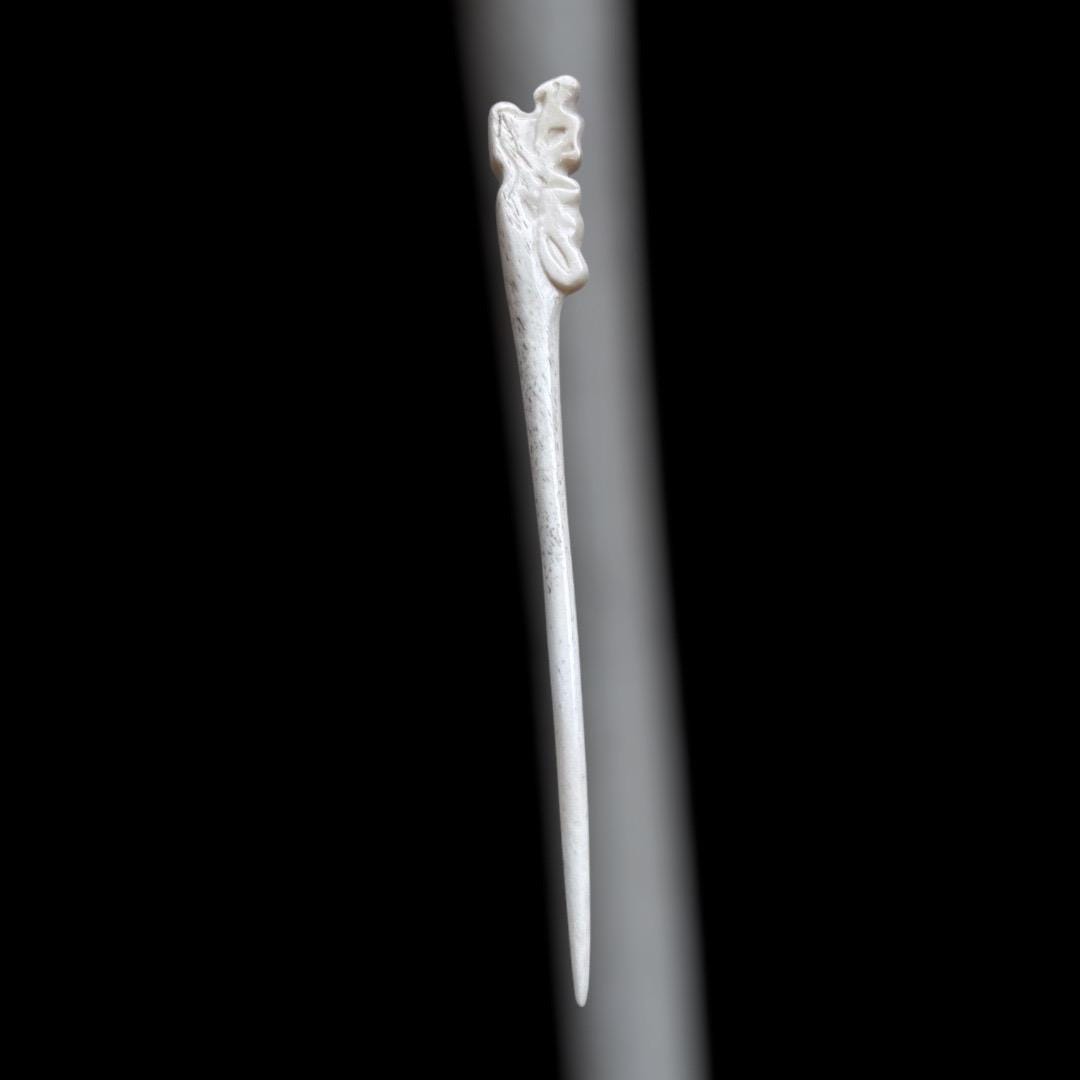 Diese Haarnadel oder Gewandnadel wurde nach einem Fund von den Shetlandinseln gearbeitet . Wie im Original, wurde sie aus Knochen geschnitzt . Sie ist mit einem stilisierten Drachenkopf verziert und etwa 14,5cm lang. Der Knochen wurde auf Hochglanz poliert.